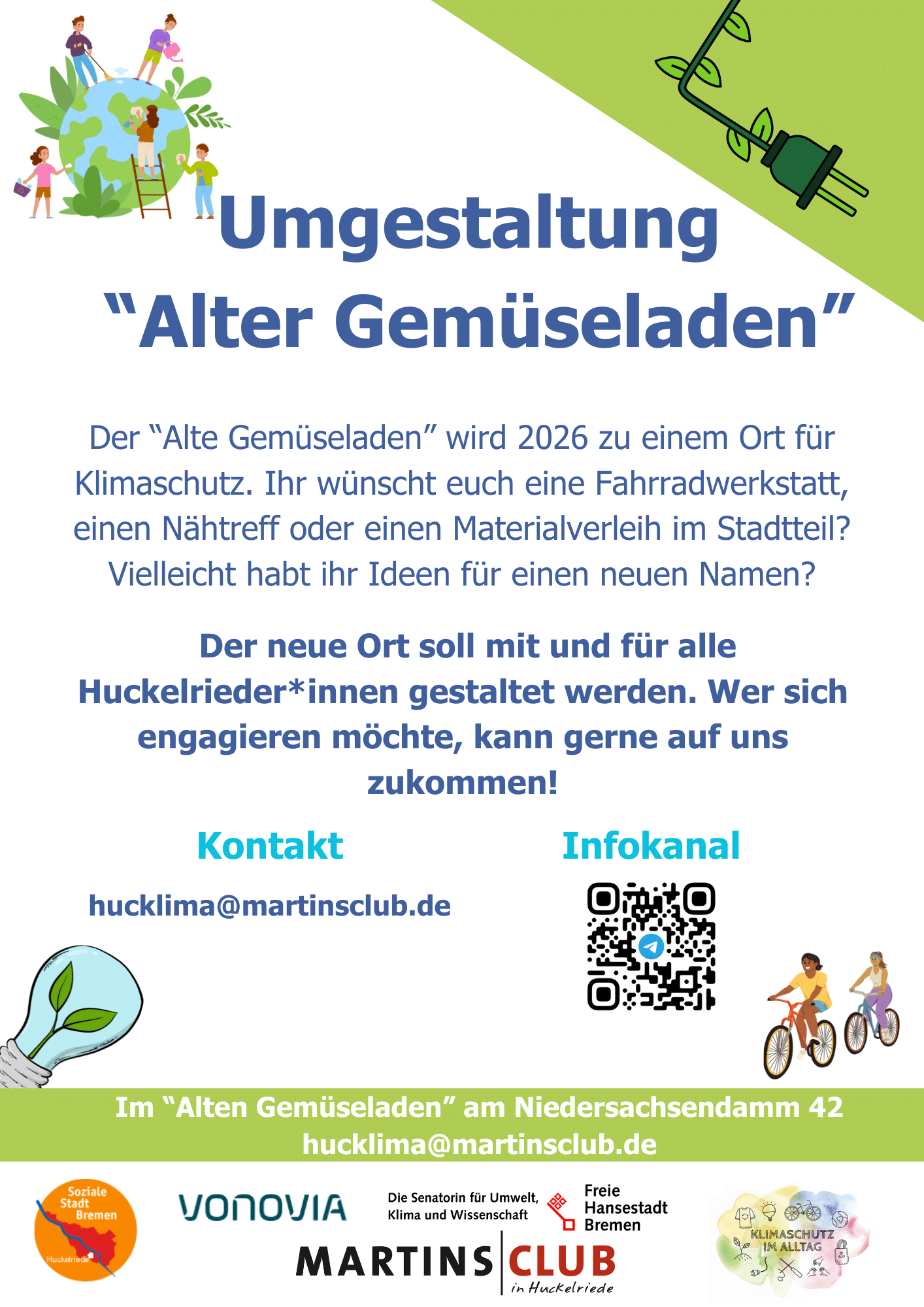 Der „Klimatreff“ ist Teil des vom Martinsclub angeschobenem „Klimaprojekt Huckelriede“, mit dem der Verein einen Beitrag zum Klimaschutz leisten will. Dabei soll vermittelt werden, wie Umwelt- und Klimaschutz ganz einfach im Alltag gelingen und die Nachbarschaft bereichern kann. Unterstützt durch das Förderprogramm ‚Klimaschutz im Alltag‘ der Senatorin für Umwelt, Klima und Wissenschaft der Freien Hansestadt Bremen.